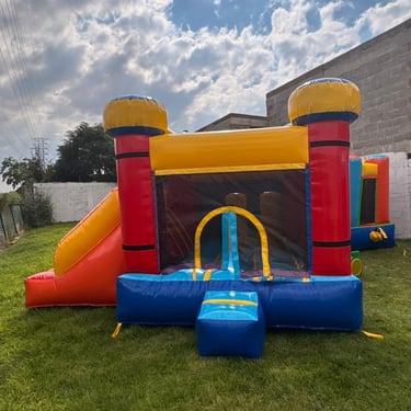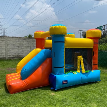 Inflable compacto con resbaladilla, ideal para patios y espacios reducidos. Diseño atractivo con bolas decorativas arriba y estructura segura para su usu infantil.